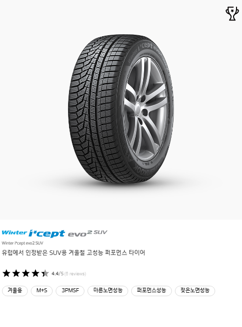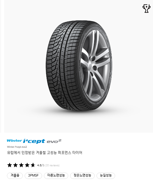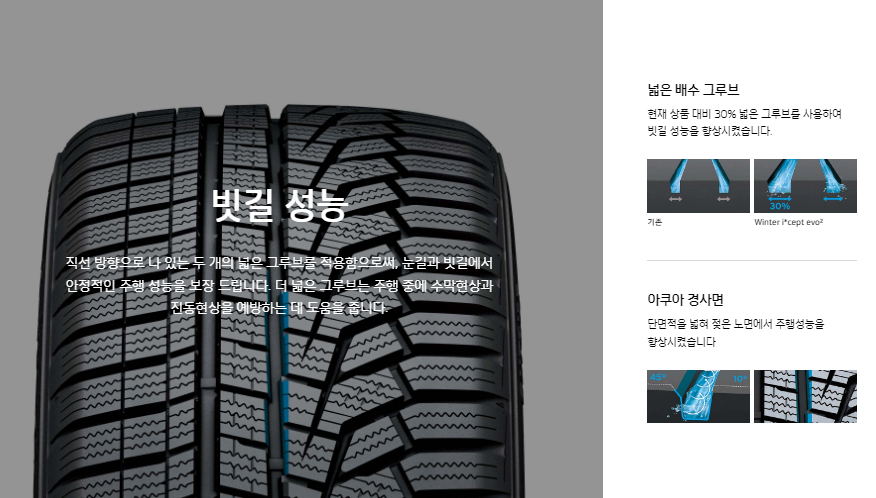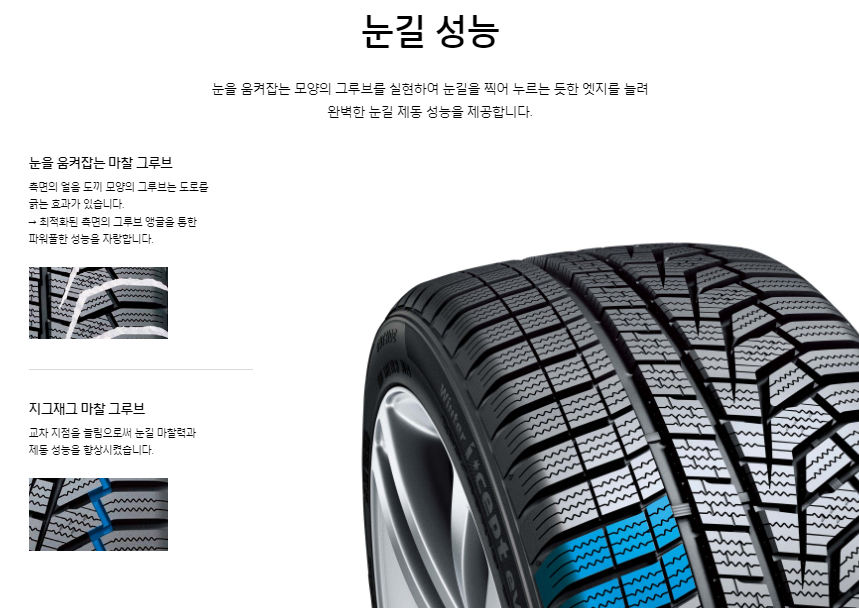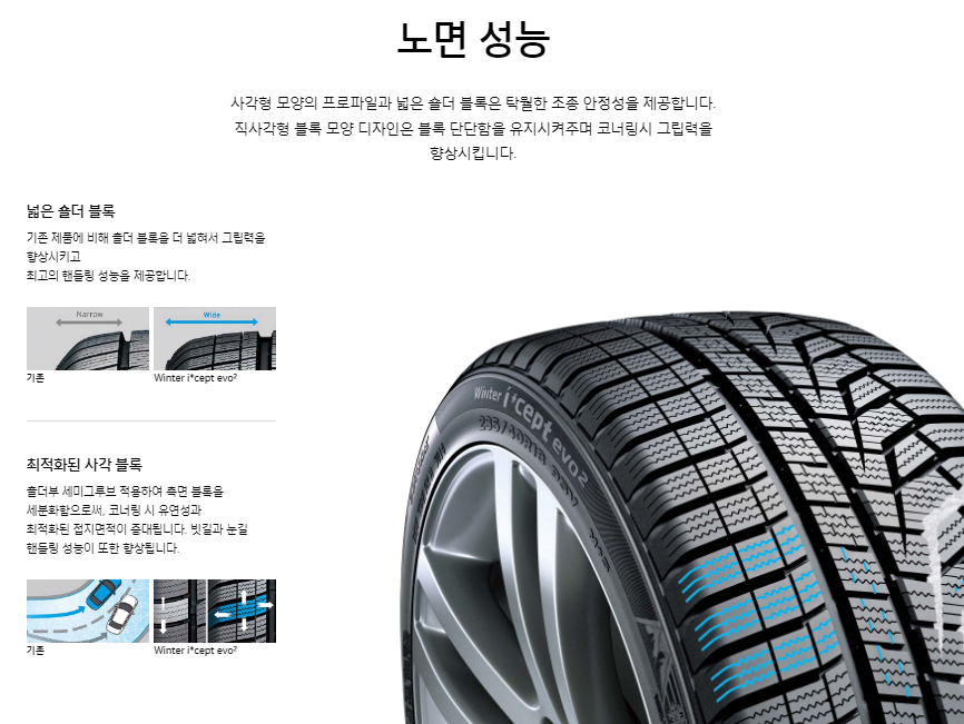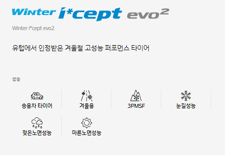 한국타이어는 겨울 윈터타이어로 대표 브랜드 아이셉트(I*CEPT)가 있습니다. 유럽에서 인정받은 겨울철 고성능 퍼포먼스 타이어로 evo2 타이어가 인기입니다.