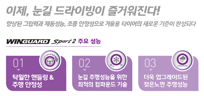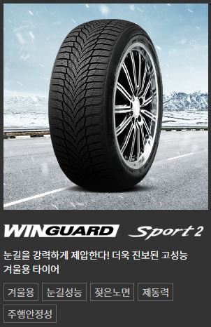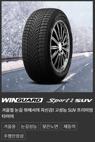 대한민국 렌털 타이어 시장의 대표 브랜드 넥센타이어에서 출시한 겨울철 윈터 타이어 브랜드 중 WINGUARD SPORT2는 승용과 SUV 두 가지 타입의 브랜드가 있습니다.