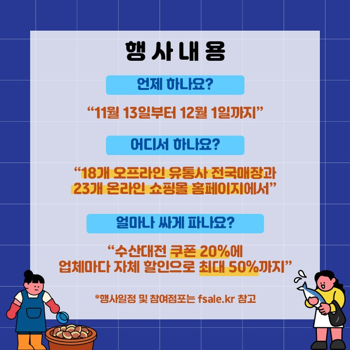 이미 김장을 시작한 집도 많은 24년 말이 성큼 다가왔습니다. 여러분 요즘 가파르게 오른 물가에 김장 제대로 준비 하셨나요? 조금 더 싸고 좋은 물건을 사면 좋겠다는 생각이 늘 드는데요 이번에 정부에서 진행하는 코리아 수산페스타로 합리적인 가격으로 재료를 준비해 보세요. 기간이 정해져 있으니 서두르세요