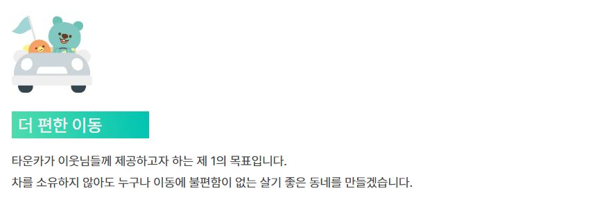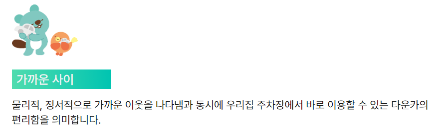 타운카는 지역 주민들이 자신의 차량을 이웃과 공유할 수 있도록 돕는 플랫폼입니다. 이 서비스를 통해 이웃간에 더 많은 소통이 이루어지며, 차량 유지 비용을 절감할 수 있습니다. 또한, 차량을 소유하지 않은 사람들에게도 필요한 순간에 차량을 쉽게 이용할 수 있는 기회를 제공합니다.