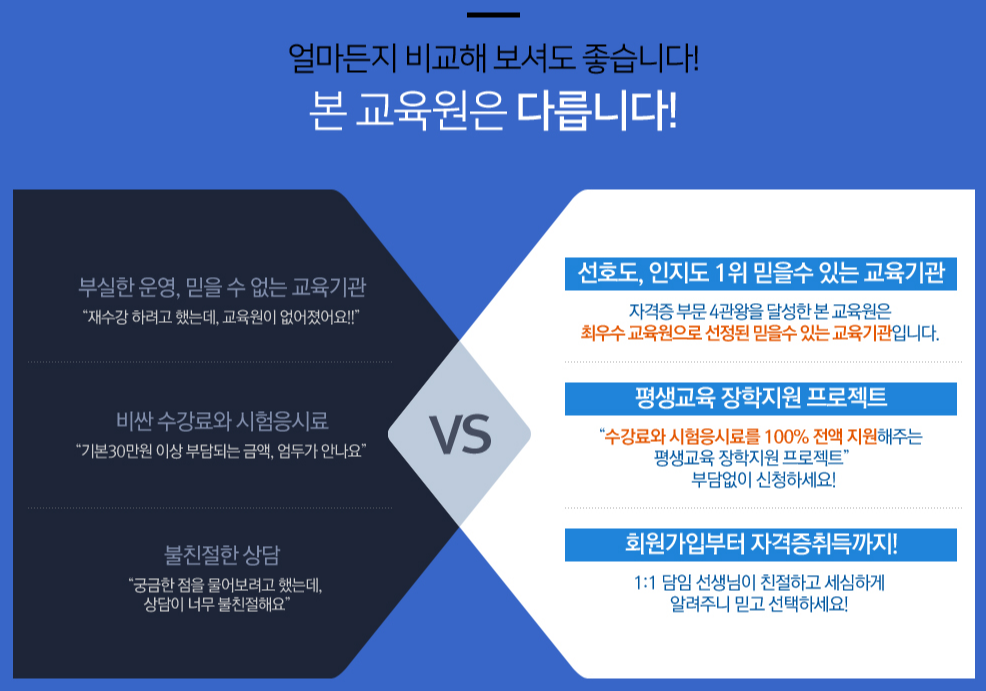 200여가지가 넘는 국가자격증 리스트 중 7개를 골라 무료로 국가자격증 강의를 들을 수 있다면 여러분은 들으시겠습니까? 많은 사람들이 국가자격증 준비 중 가장 여러움을 느낀 한가지는 비용적인 부분이었습니다. 투자에 대한 개념은 다들 이해하고 있으나, 비용이 얼만큼 들지 어디에 들지 또 교제비는 얼마나 클지 등 다양한 부분에 대한 정보가 적어 시작하기에 앞서 두려움을 느낀다고 합니다. 그러나 이번에 소개되는 이 사이트는 7개의강좌를 무료로 신청할 수 있으니 도장깨기 하듯 여러분의 능력을 평가해 7개의 연관 자격증을 준비해보세요.