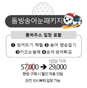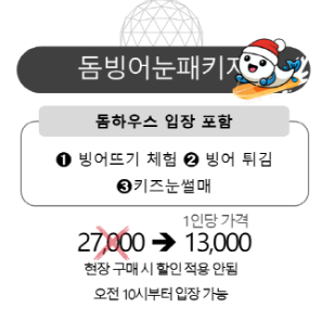 - 돔빙어눈패키지 : 빙어뜨기체험 + 빙어튀김 + 키즈눈썰매