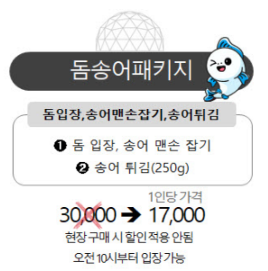 - 돔송어패키지 : 돔입장, 송어 맨손잡기 + 송어튀김