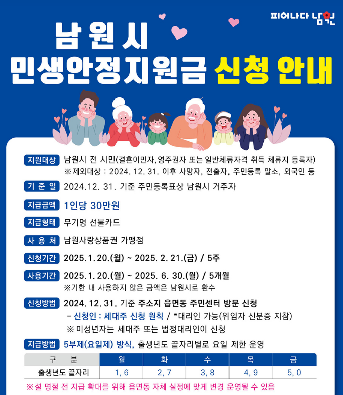 이번 남원시 민생회복 지원금은 남원시 전 시민에게 지급됩니다. 2024년 12월 31일 기준 주민등록표상 남원시 거주자, 결혼이민자, 영주권자 또는 일반체류자격 취득 체류지 등록자까지 모드 지급된다고 합니다.