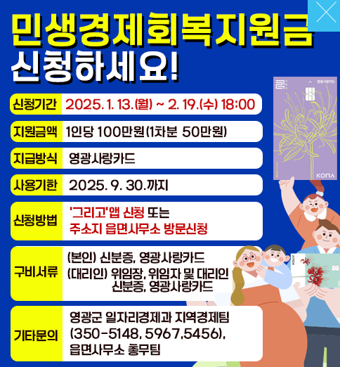 영광 군민을 위한 민생지원금이 지급됩니다. 1인당 50만 원이 지역화폐로 제공되며, 신청은 온라인 또는 오프라인에서 가능합니다. 신청 및 사용 기한이 정해져 있으니 기한 내 신청하세요.