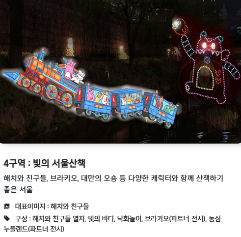 - "서울 빛을 놀이하다"를 주제로 청계광장 및 청계천 일대에서 진행됩니다.