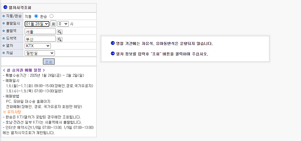 2025 설 기차 예매하기에서 가장 꿀팁은 실시간 잔여석을 조회하는 것입니다. 시간별 잔여석은 대략적인 시간 내에 KTX, ITX, 무궁화호 등의 열차에 예약 현황이 많은, 보통, 매진으로 구분하여 각 시간대 현황을 알려주는 코레일의 서비스입니다. 이 실시간 조회를 통해 내가 가고자 하는 날의 어느 시간대 기차를 예매하는 것이 예매 성공률을 올려주는지 확인 가능합니다. 이 잔여석 현황을 통해 예매 성공률을 높일 수 있는 예매일자와 출발 시간대를 확인해 보시면, KTX도 예매가 가능합니다. 내가 예매하고자 하는 날이 메인 시간대에 매진이 확실시된다면 다른 시간대를 알아보고 예매 전략을 짜는 것이 효과적입니다.