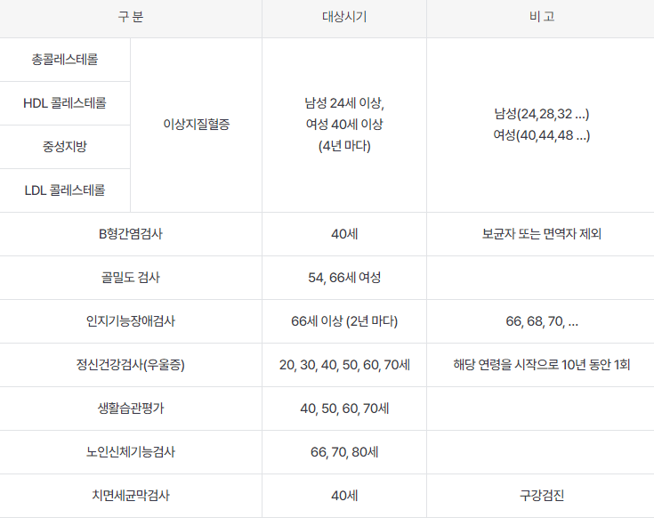 아래 표는 건강검진센터에서 제공하는 대상시기별 구분이므로 더 구체적인 검사 내용은 아래 버튼을 통해 확인하시길 바랍니다.