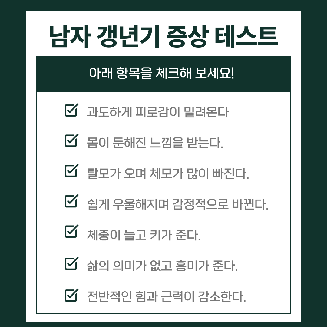 남자갱년기는 자연스러운 과정이지만, 이를 잘 관리하고 극복하는 것이 중요합니다. 자신의 건강을 소중히 여기고, 필요한 조치를 취하는 것이 남자갱년기를 극복하는 첫걸음입니다. 지금 바로 자신의 상태를 점검하고, 건강한 삶을 위한 행동을 시작해 보세요.